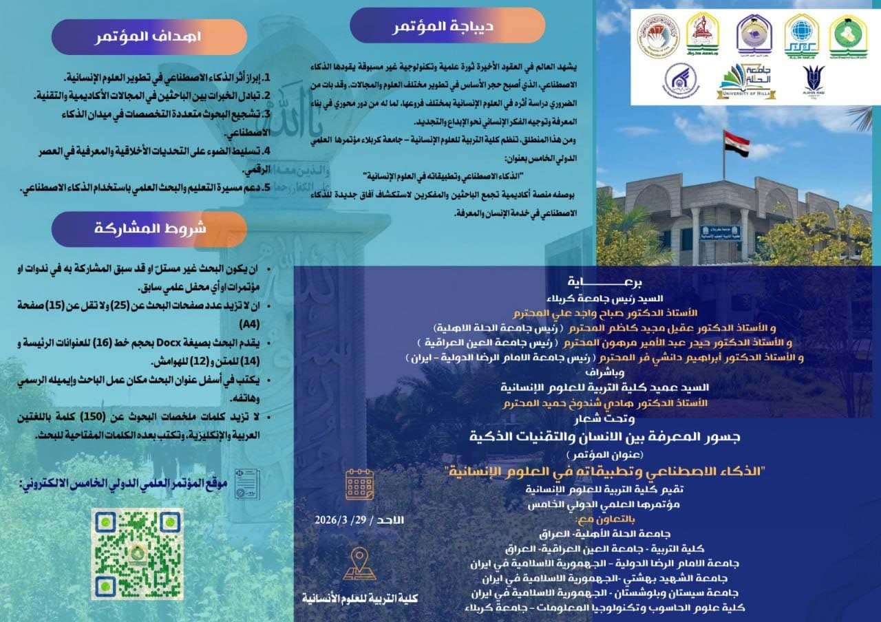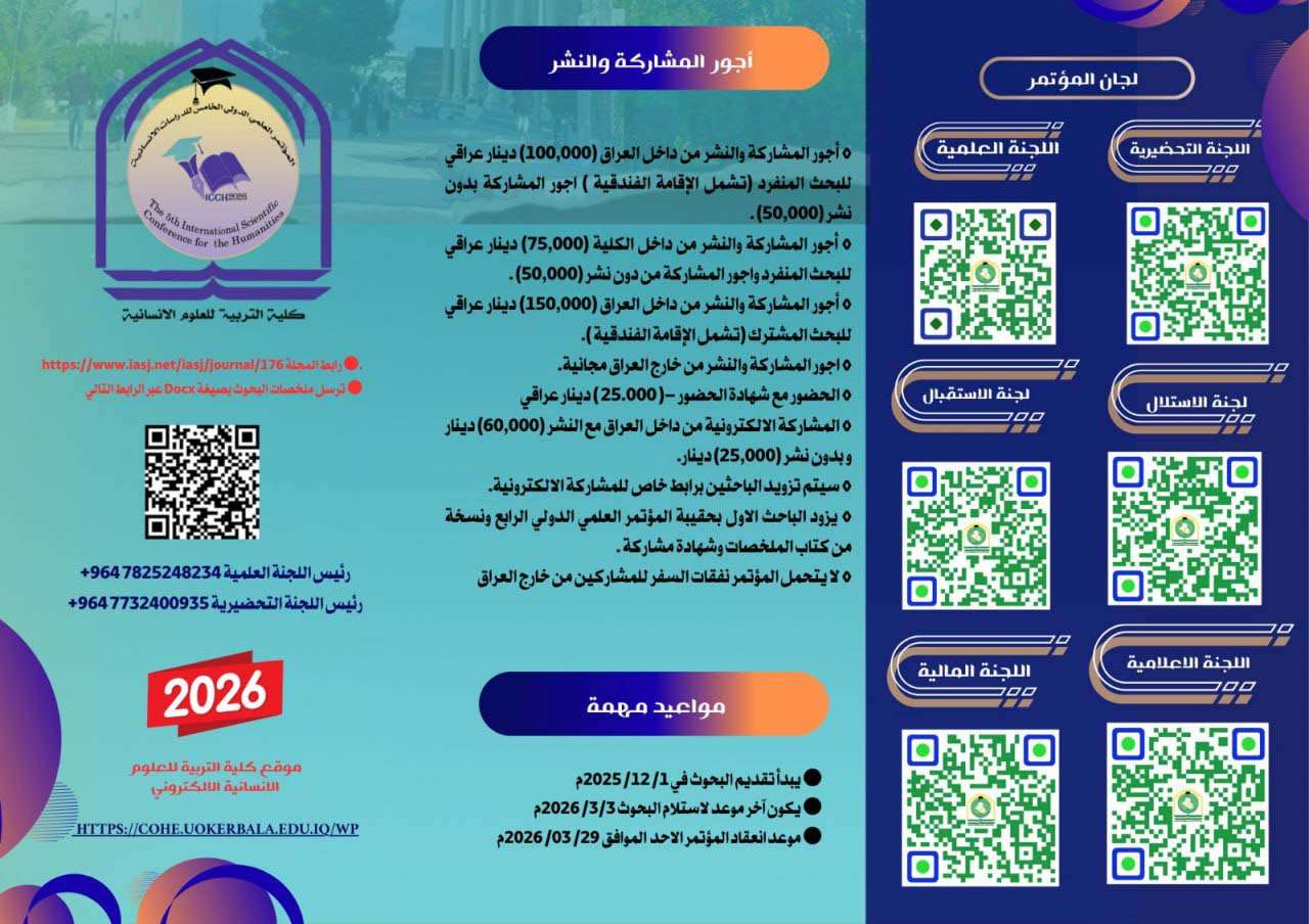 بخصوص المشاركة في مؤتمر الكلية الباحثين من داخل الجامعة يكون دفع الاجور في شعبة الشؤون المالية في عمادة كلية التربية للعلوم الانسانية اما الباحثين من خارج الجامعة او خارج محافظة كربلاء يتم ارسال الاجور الى