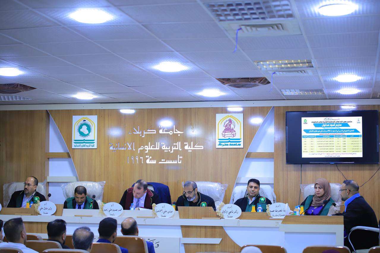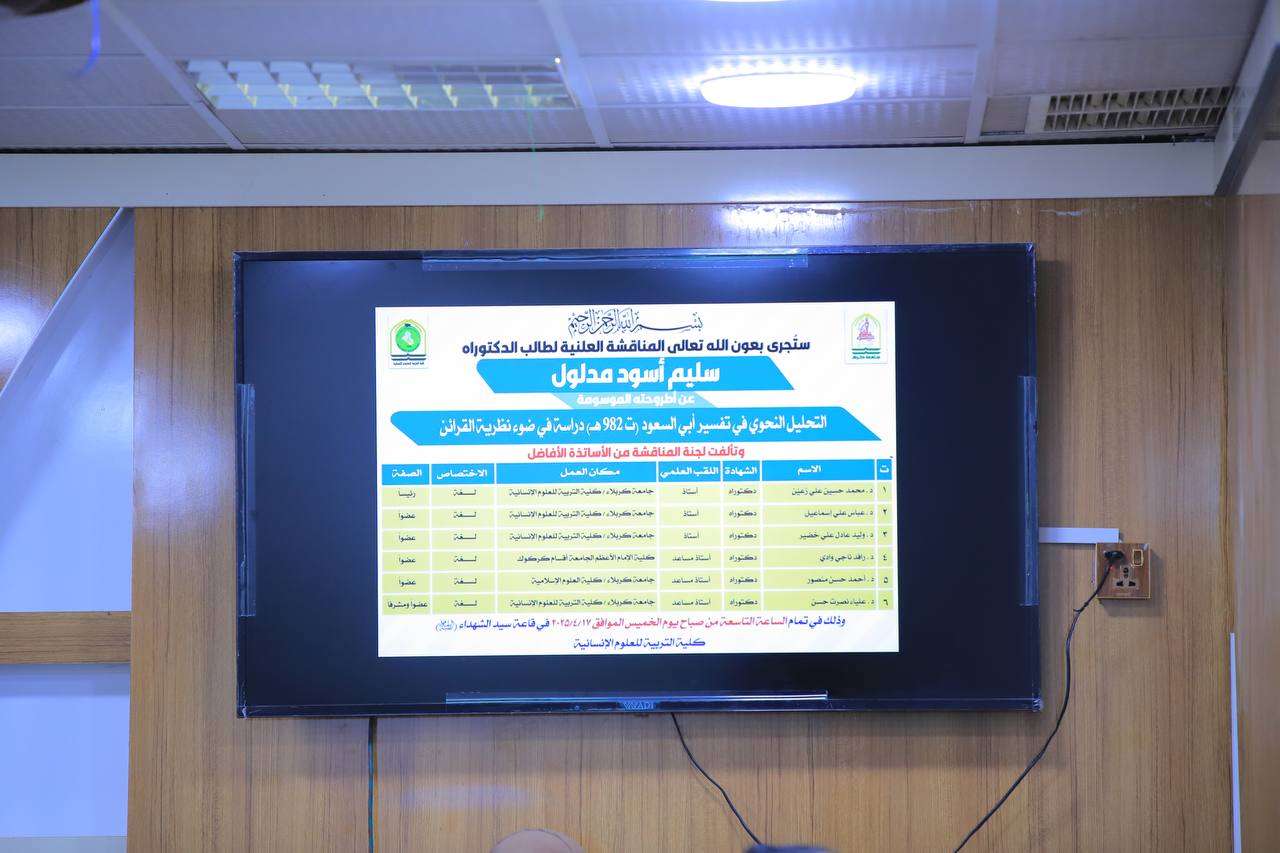نوقشت في قسم اللغة العربية بكلية التربية للعلوم الإنسانية بجامعة كربلاء أطروحة الدكتوراه الموسومة ” التحليل النحوي في تفسير أبي السعود -ت 982 هـ دراسة في ضوء نظرية القرائن” للطالب سليم أسود مدلول، وبإشراف أ.م.د. علياء نصرت حسن.