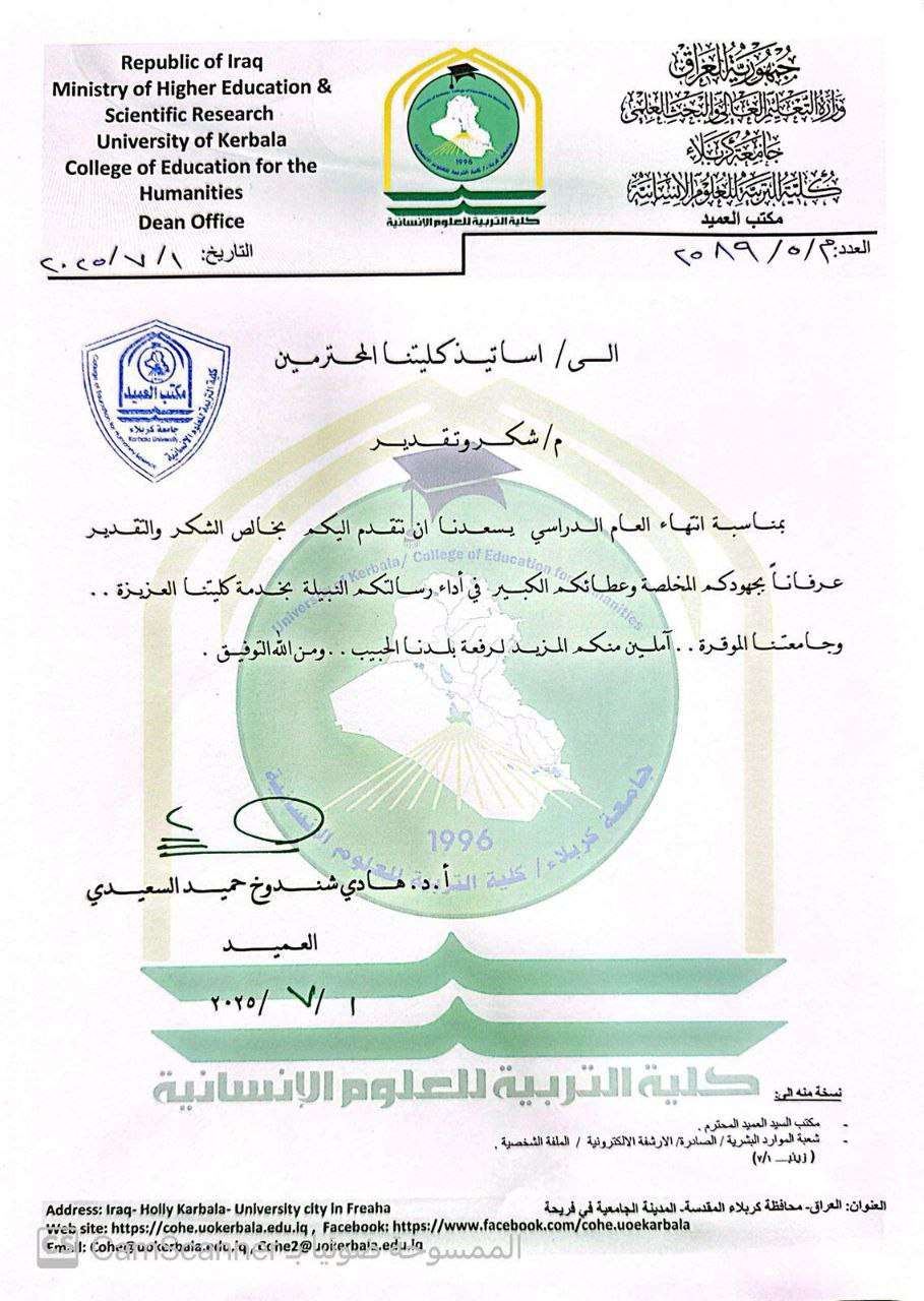 قدّم السيد عميد كلية التربية للعلوم الإنسانية في جامعة كربلاء، الأستاذ الدكتور هادي السعيدي المحترم، كتاب شكر وتقدير إلى الهيئة التدريسية في الكلية، وذلك بمناسبة انتهاء العام الدراسي 2024–2025، تقديرًا لجهودهم المبذولة في أداء المهام الأكاديمية والعلمية والإدارية، وحرصهم على إنجاح المسيرة التعليمية في الكلية.