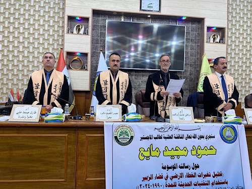 ترأس الأستاذ الدكتور مرتضى جليل إبراهيم المعموري، التدريسي في قسم الجغرافية التطبيقية بكلية التربية للعلوم الإنسانية ورئيس لجنة الترقيات العلمية المركزية في جامعة كربلاء، لجنة مناقشة رسالة الماجستير الموسومة: “تحليل تغيرات الغطاء الأرضي في قضاء الزبير باستخدام التقنيات الحديثة للمدة 1990–2024”، المقدّمة من الطالب حمود مجيد مايع، وذلك في كلية التربية للعلوم الإنسانية / جامعة البصرة.
