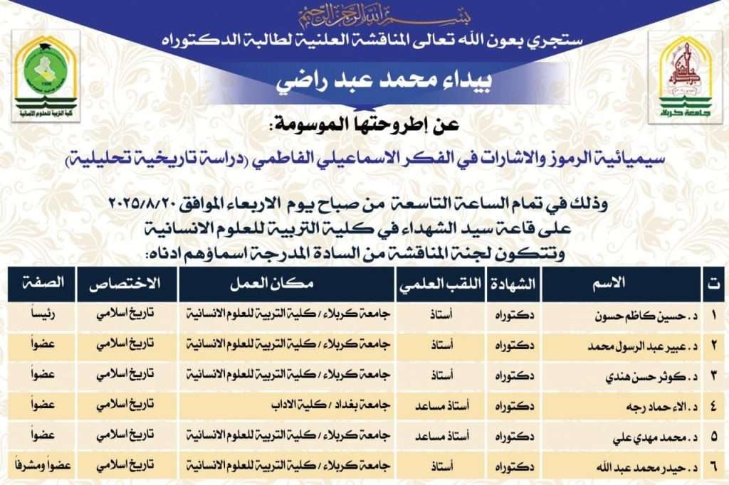 حصلت الأستاذ المساعد بيداء محمد عبد راضي، التدريسية في قسم التاريخ بكلية التربية للعلوم الإنسانية/ جامعة كربلاء، على درجة الدكتوراه في التاريخ الإسلامي عن أطروحتها الموسومة: “سيميائية الرموز والإشارات في الفكر الإسماعيلي الفاطمي (دراسة تاريخية تحليلية)”، وذلك من جامعة كربلاء/ كلية التربية للعلوم الإنسانية.هدفت الأطروحة إلى استكشاف مكانة الرموز والإشارات (علم السيمياء/ علم العلامات) في الفكر الإسماعيلي الفاطمي، والكشف عن الأبعاد المعرفية والروحية التي تحملها هذه الرموز والإشارات، ودورها في تكوين رؤية شاملة للوجود والمعرفة والدين وحركة التاريخ.تألفت الأطروحة من أربعة فصول: تضمن الفصل الأول الجذور السيميائية وإشكالية المصطلح والمفهوم، وخُصص الفصل الثاني لدراسة الرموز والإشارات ودلالاتها في القرآن والخطاب النبوي وفكر أهل البيت (عليهم السلام)، كما عالج الفصل الثالث سيميائية الرموز والإشارات في الفكر الإسماعيلي، فيما خُصص الفصل الرابع لدراسة نماذج من الرموز والإشارات في الفكر الإسماعيلي الفاطمي.وتوصلت الدراسة إلى أن علم السيمياء (التوسم) أو ما يُعرف بعلم العلامات يمتد بجذوره إلى التراث الفكري الإسلامي، وأن دراسة الرموز والإشارات لا يمكن أن تتم بمعزل عن الأنساق العلاماتية والسيميائية، كما كشفت الدراسة أن الرموز والإشارات في الفكر الإسماعيلي تحمل أبعادًا فلسفية وروحية عميقة تتجاوز الاستخدام الرمزي التقليدي.وبهذه المناسبة، تتقدم عمادة كلية التربية للعلوم الإنسانية بأجمل التهاني والتبريكات للتدريسية على هذا المنجز العلمي، متمنيةً لها دوام التوفيق والنجاح في مسيرتها الأكاديمية.