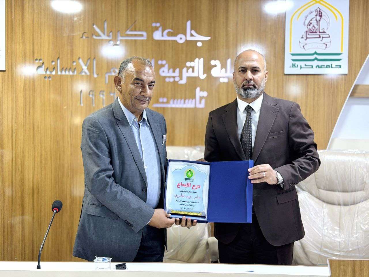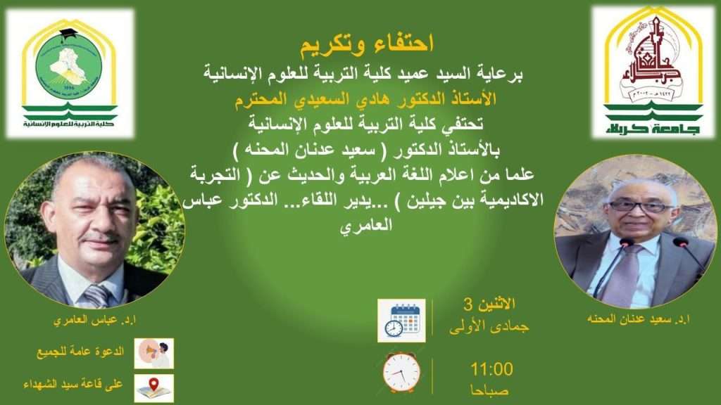برعاية وإشراف عميد كلية التربية للعلوم الإنسانية، الأستاذ الدكتور هادي السعيدي، أقيمت جلسة احتفالية لتكريم الأستاذ الأكاديمي والناقد والباحث الكبير، الأستاذ الدكتور سعيد عدنان المحنه، تقديراً لمسيرته التربوية الحافلة بالعطاء العلمي. واشتملت الجلسة على محاضرة بعنوان “التجربة الأكاديمية بين جيلين”، أدارها الدكتور عباس عبيد العامري، وقدم فيها الدكتور سعيد عدنان تعريفاً شاملاً بالأكاديمية، موضحاً دورها الكبير في نشر الوعي العلمي، واستعرض جانباً مهماً من تاريخ الأكاديمية العراقية وتقاليد عملها. كما أبرز حرص أعلامها من الأساتذة المؤسسين على التمسك بالتقاليد المهنية والقيم الأخلاقية النبيلة، التي حافظت على مكانة الجامعة الاعتبارية. وفي ختام الجلسة، أهدى السيد العميد درع الإبداع للأستاذ الدكتور سعيد عدنان، الذي أمضى سنوات طويلة أستاذاً للنقد الأدبي في كلية التربية للعلوم الإنسانية – جامعة كربلاء، تقديراً لمنجزه العلمي والإبداعي وإسهاماته البارزة في المجال الأكاديمي.