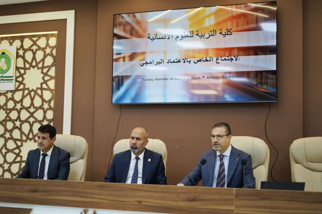 وجرى خلال الاجتماع مناقشة واقع العمل في لجان الاعتماد البرامجي، والوقوف على مكامن الخلل والتحديات التي تواجه اللجان في الأقسام المختلفة، فضلاً عن طرح مقترحات وحلول عملية تسهم في تعزيز جودة البرامج الأكاديمية ورفع جاهزيتها لمتطلبات الاعتماد.