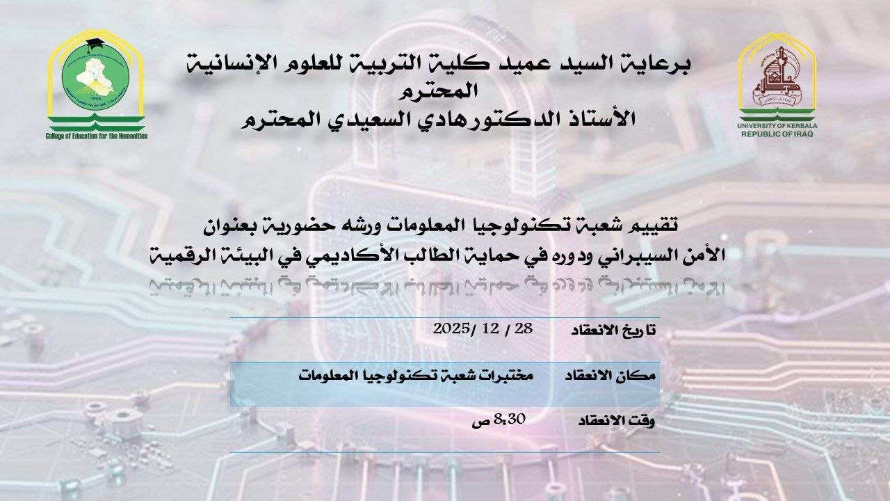 نظّمت شعبة تكنولوجيا المعلومات في كلية التربية للعلوم الإنسانية بجامعة كربلاء ورشة علمية بعنوان “الأمن السيبراني ودوره في حماية الطالب الأكاديمي في البيئة الرقمية”، حاضرت فيها مديرة الشعبة م. م. البرى ياسر عبد السجاد، وبحضور عدد من طلبة الكلية.